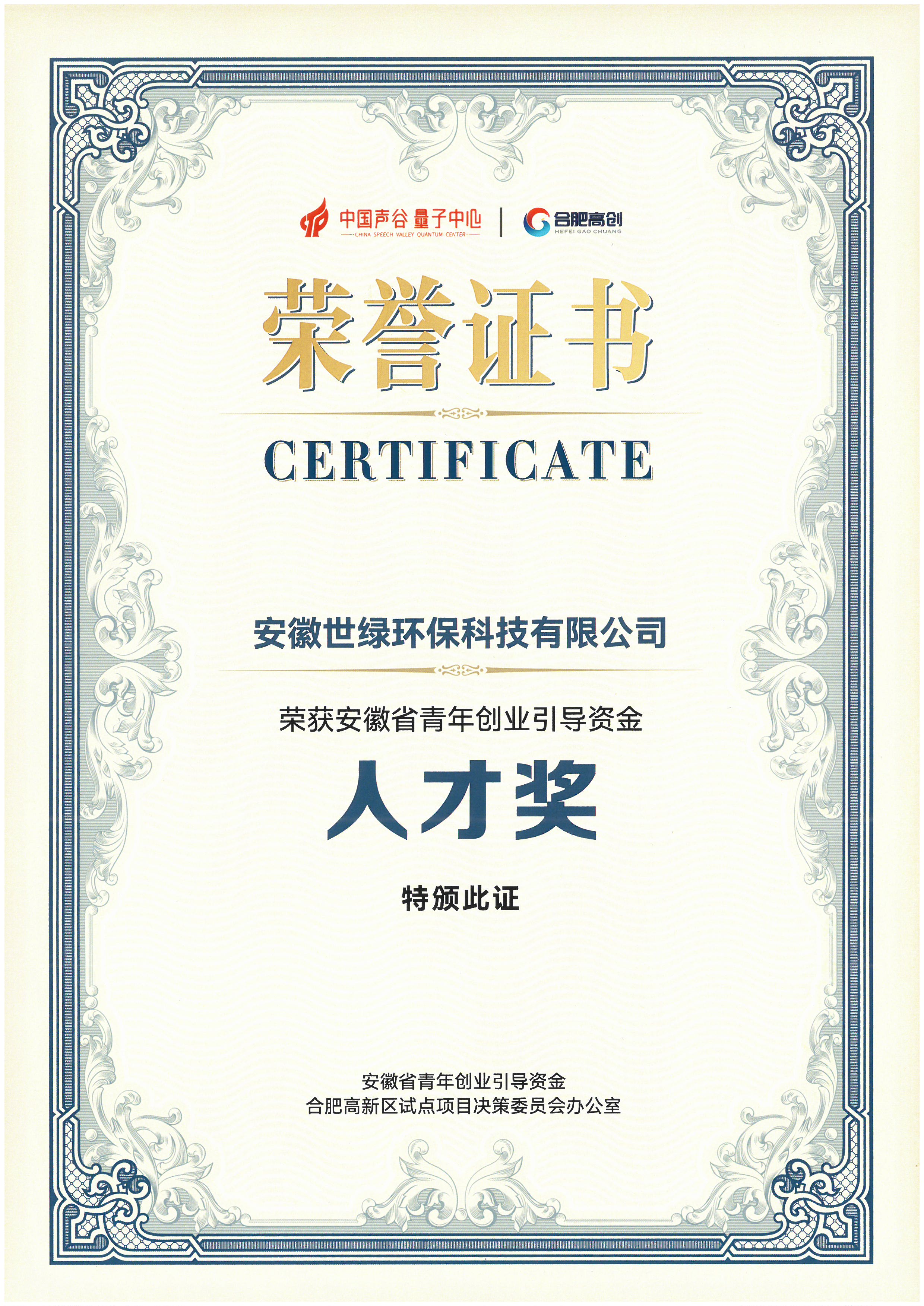世綠環保榮獲安徽省青年創業引導資金人才獎